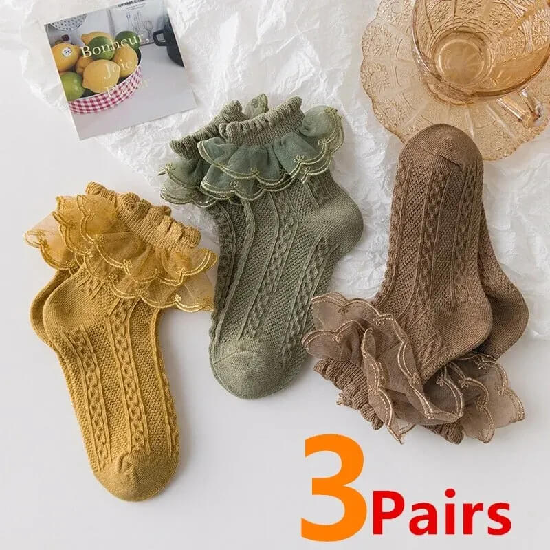 3 Pairs Set, Frilly Lace Cotton Socks for Kids (1-10 Years)