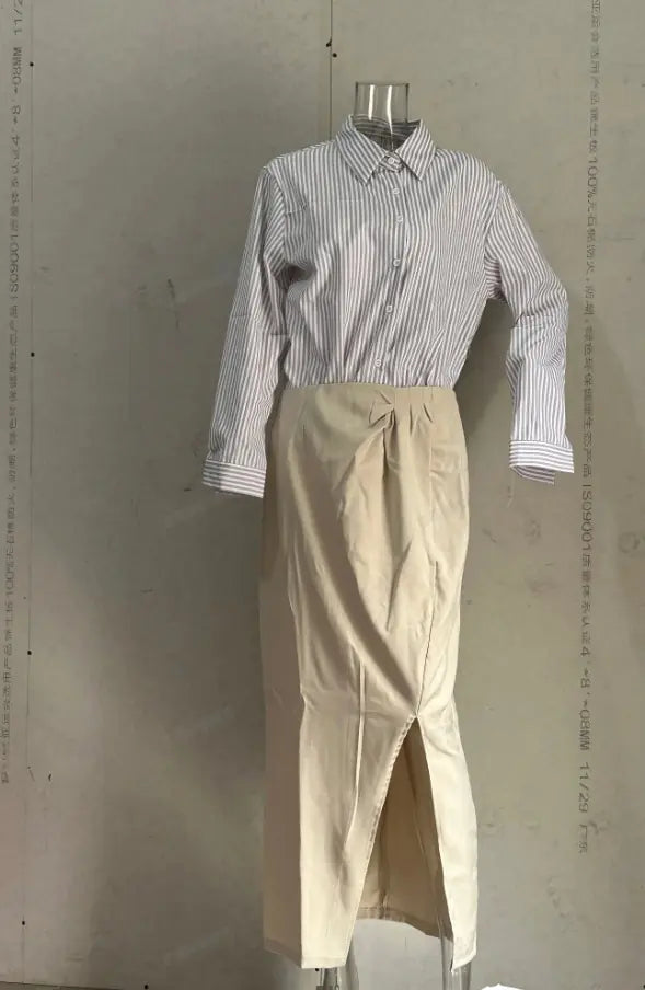 Crafted from high-quality polyester, this outfit features a modern design with a chic stripe/checkered pattern and a sophisticated lapel collar. With a flattering A-line skirt that falls to a mid-length, you'll feel confident and stylish whether you're at a brunch with friends or a formal event.