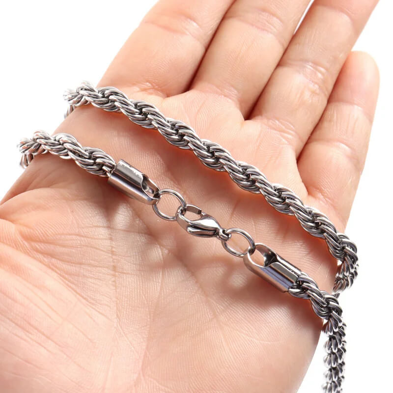 Each link of this classic rope chain is intricately twisted to create a stunning visual appeal and a durable design that will withstand the test of time. Made from high-quality stainless steel, it offers both strength and resilience, ensuring long-lasting wear without tarnishing or fading.
